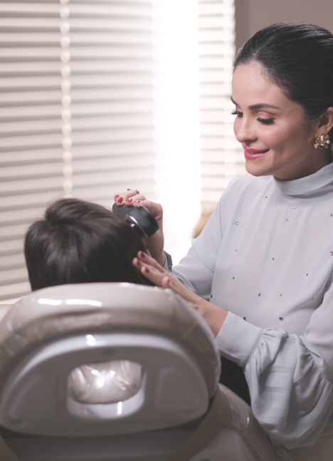 A técnica FUE, utilizada na clínica, consiste na extração fio a fio dos folículos da área doadora, por não ser necessário incisão, não deixa cicatrizes no couro cabeludo, sendo considerada inclusive a técnica menos invasiva e minimamente dolorosa. Os folículos retirados são implantados um a um nas áreas afetadas, visando preencher novamente a área.